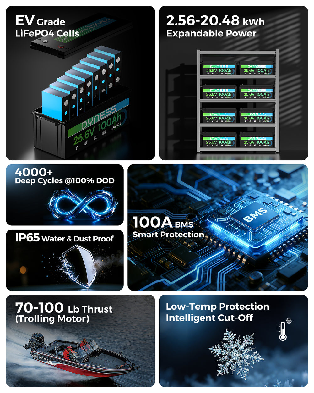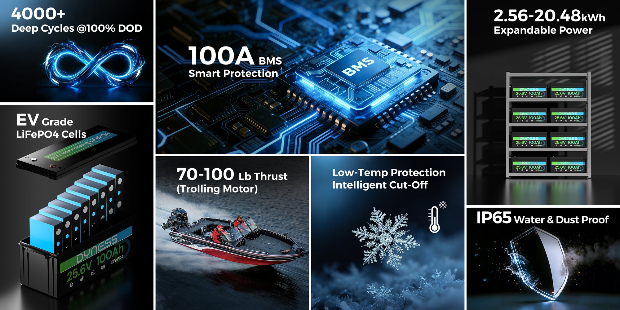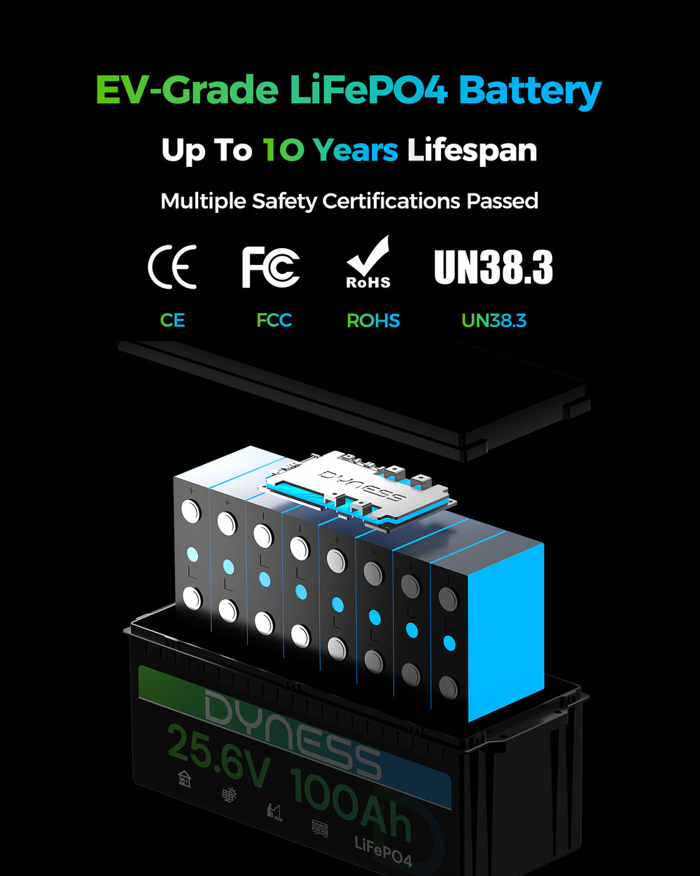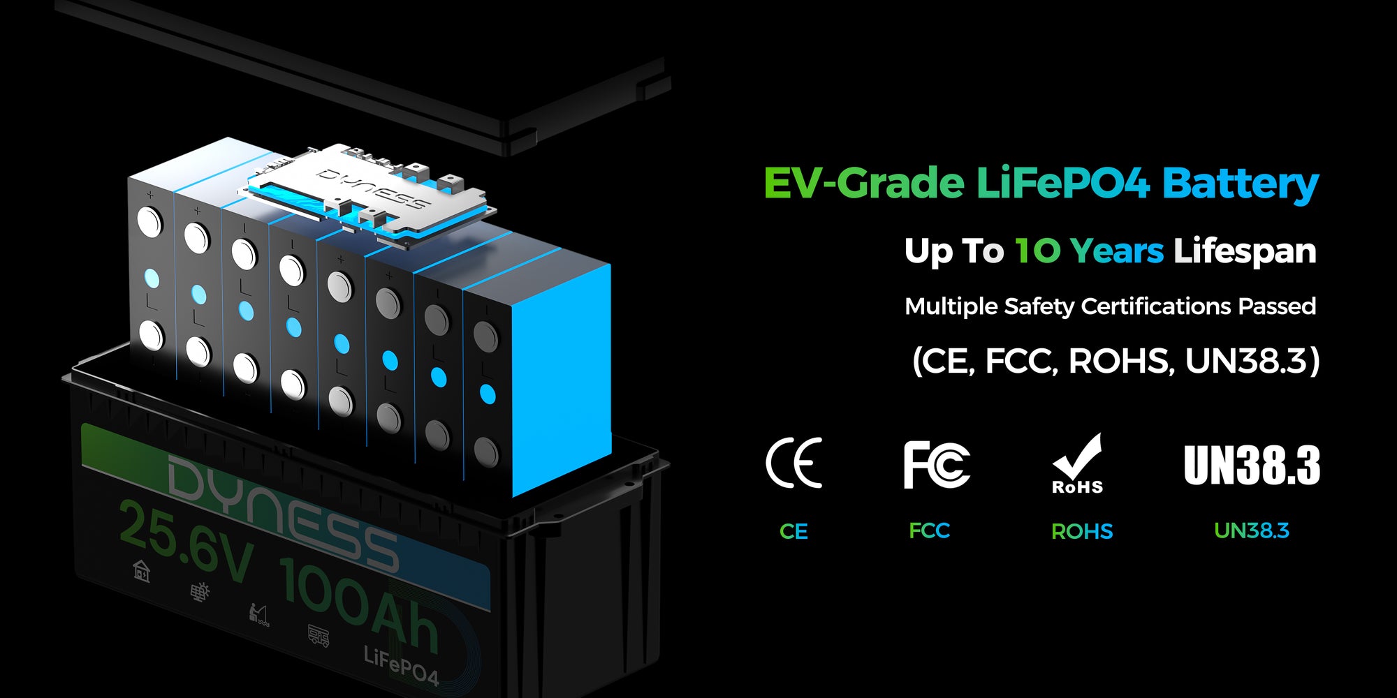 The Dyness 25.6V 100Ah LiFePO₄ Battery is built with premium A+ grade lithium iron phosphate cells, delivering outstanding durability, safety, and long-lasting power for automotive, solar, and marine applications. Each cell is rigorously tested by our professional engineering team, allowing full traceability of production parameters for complete peace of mind.