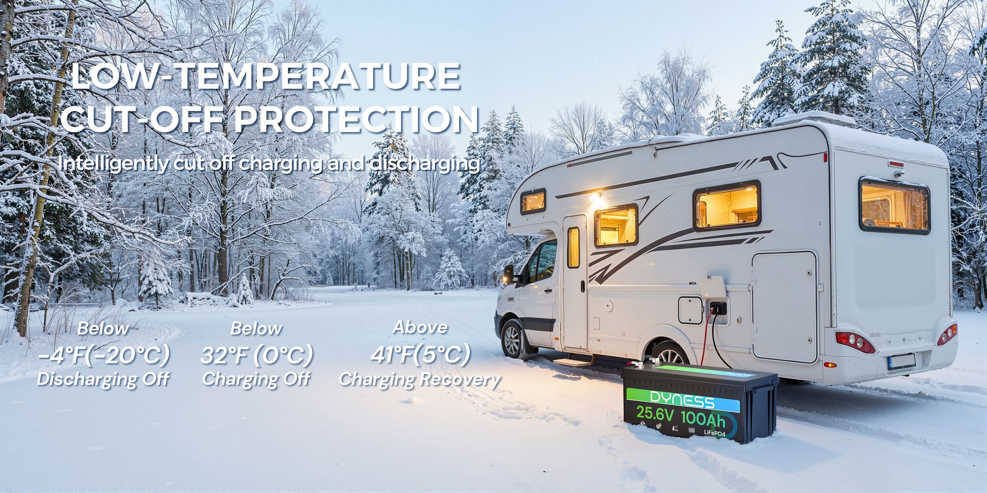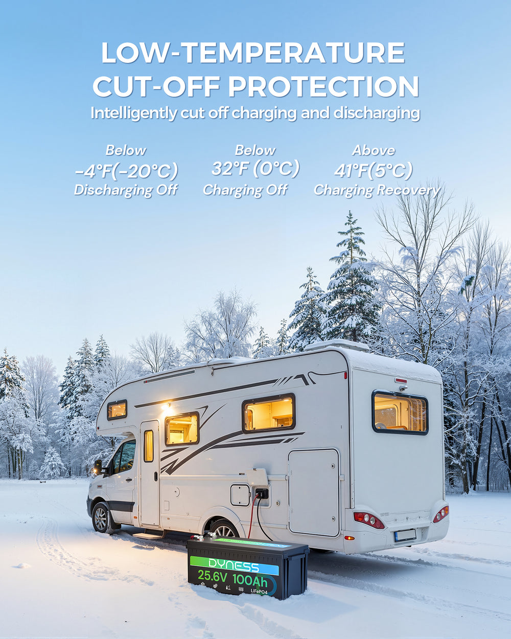 Featuring an automotive-grade low-temperature cut-off design, the battery automatically stops charging when the internal temperature falls below 32°F (0°C) and resumes charging at 41°F (5°C). It also disconnects power at -4°F (-20°C) to protect internal components and ensure safe performance in extreme cold conditions.