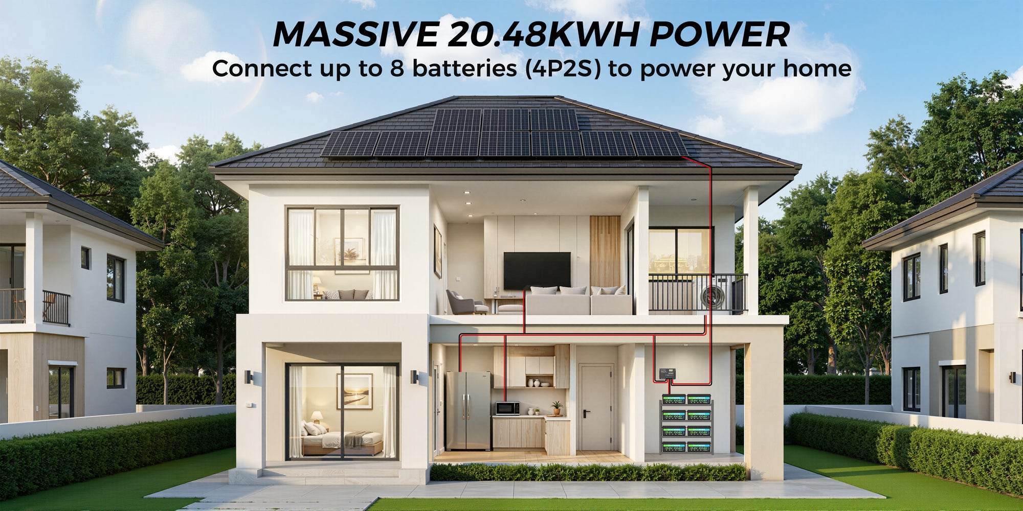 With a powerful 2560Wh capacity, the Dyness 25.6V 100Ah battery supports up to 4P2S configuration, forming a 51.2V 400Ah (20.48kWh) system for extended runtime. Ideal for RVs, off-grid solar setups, marine use, and home backup power storage.