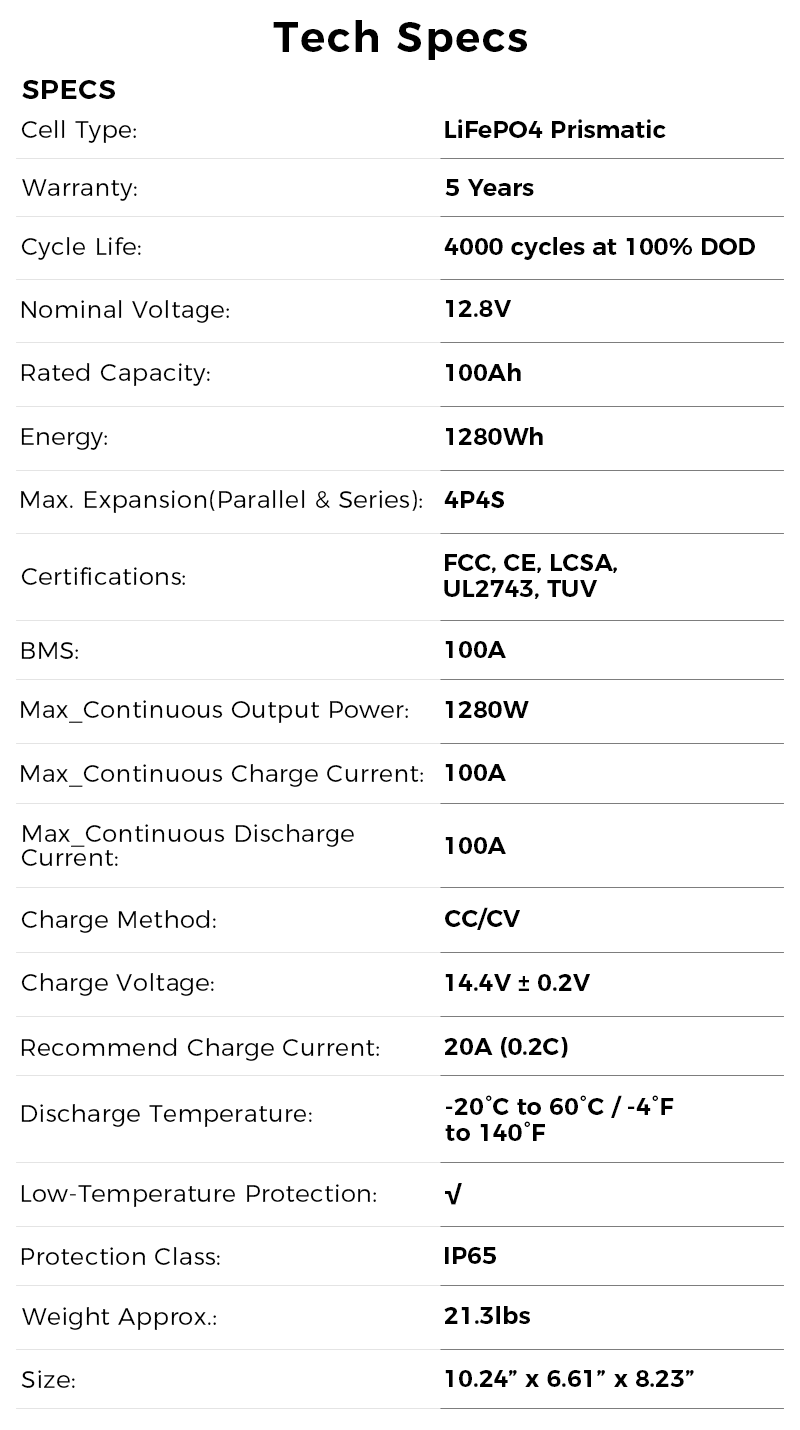 Parallel Connection: Connect up to 4 batteries to increase capacity to 400Ah.