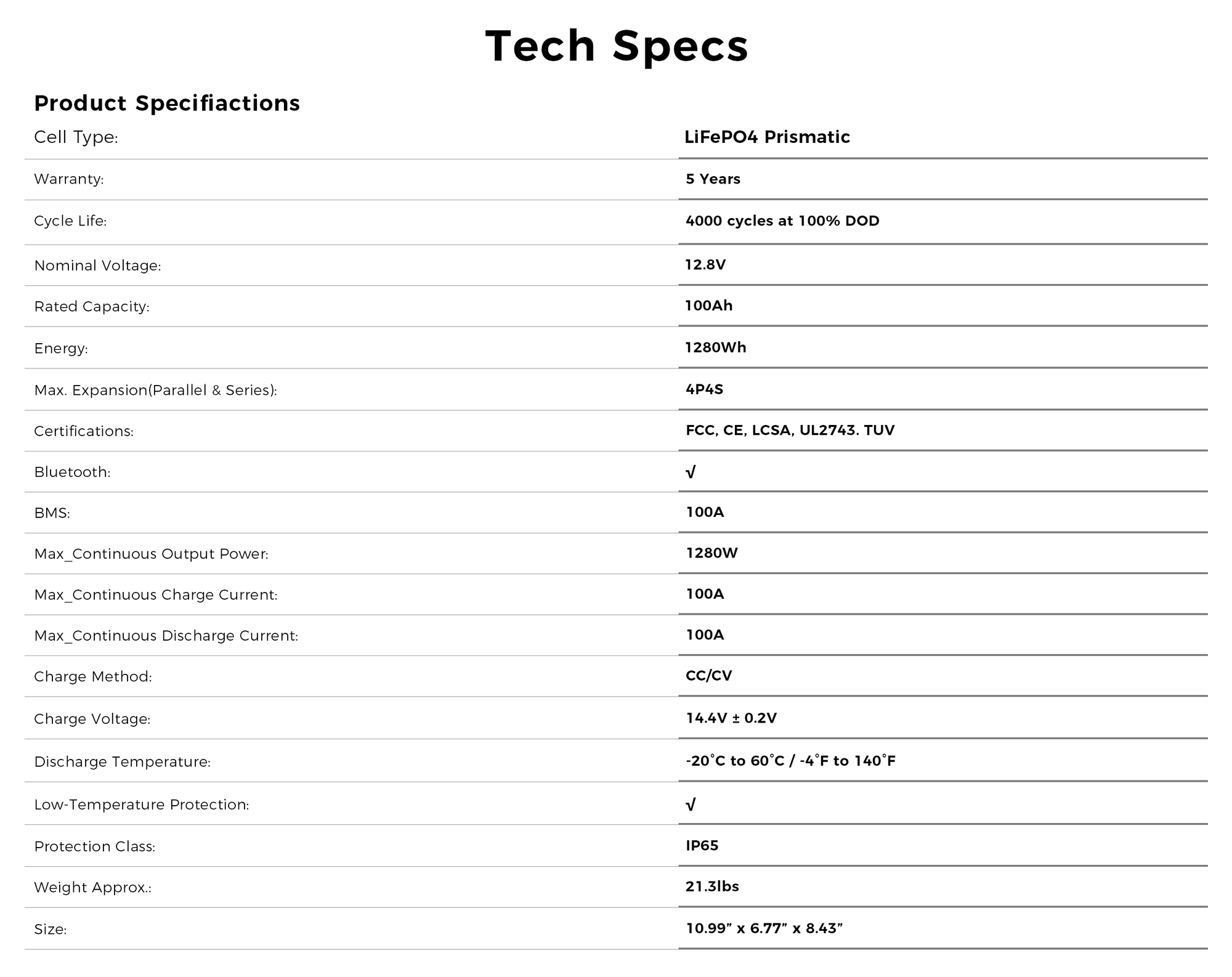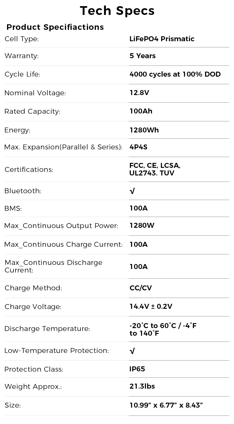 Parallel Connection: Connect up to 4 batteries to increase capacity to 400Ah.