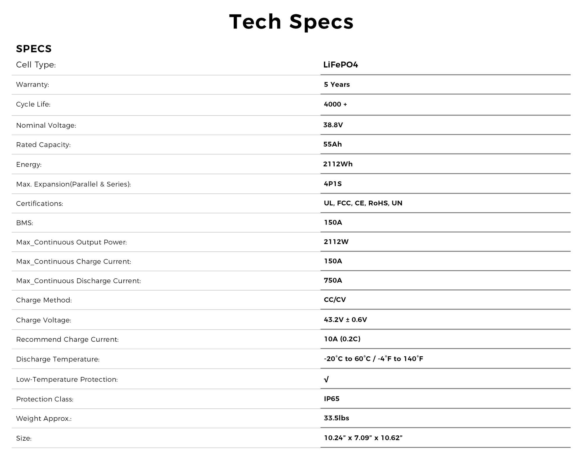 Connect up to 4 batteries in parallel to build a 38.4V 220Ah system delivering 8448Wh of energy.