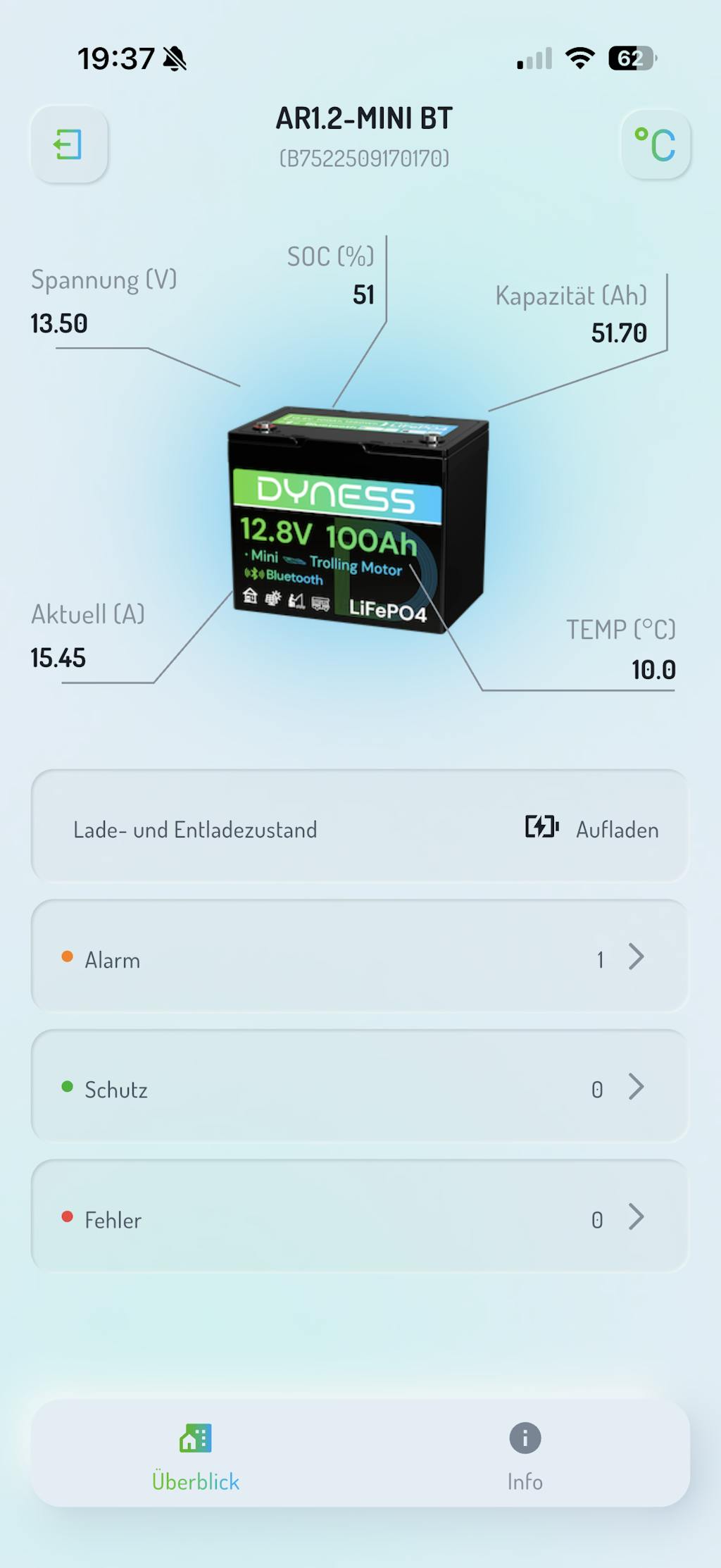The Dyness 12V 100Ah Bluetooth LiFePO4 battery delivers up to 10 years of service life and comes with a 5-year warranty. It supports 4,000 cycles at 100% depth of discharge (DOD), 6,000+ cycles at 80% DOD, and over 15,000 cycles at 60% DOD. For optimal performance, charge at 14.6V with a 20A current—fully charging in about 5 hours.