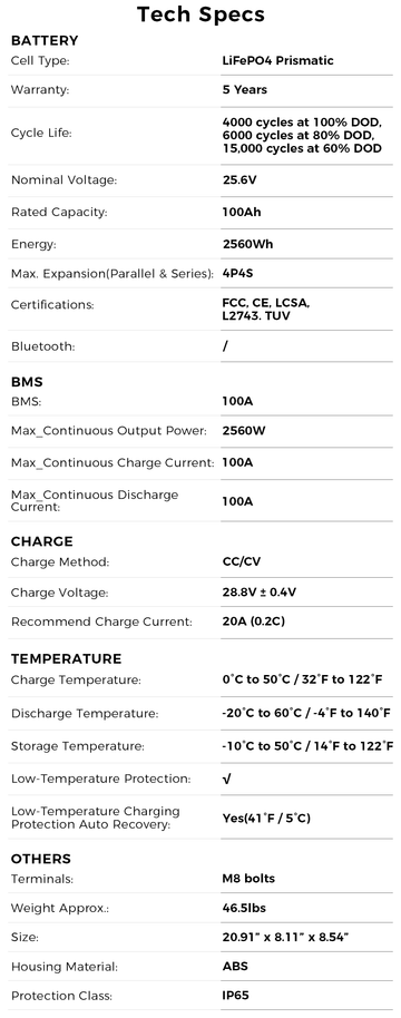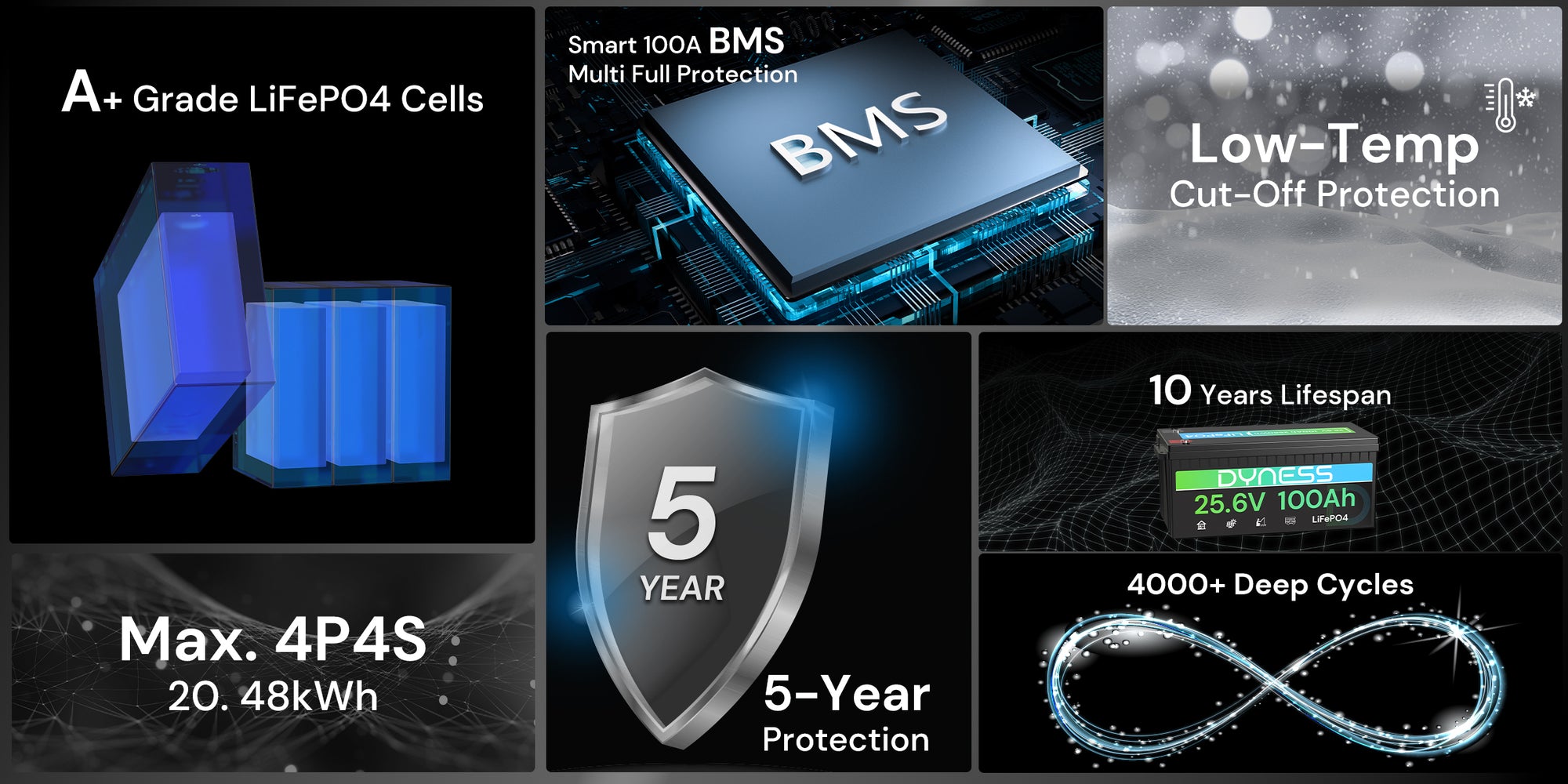 The Dyness 25.6V 100Ah LiFePO₄ Battery is built with premium A+ grade lithium iron phosphate cells, delivering outstanding durability, safety, and long-lasting power for automotive, solar, and marine applications. Each cell is rigorously tested by our professional engineering team, allowing full traceability of production parameters for complete peace of mind.