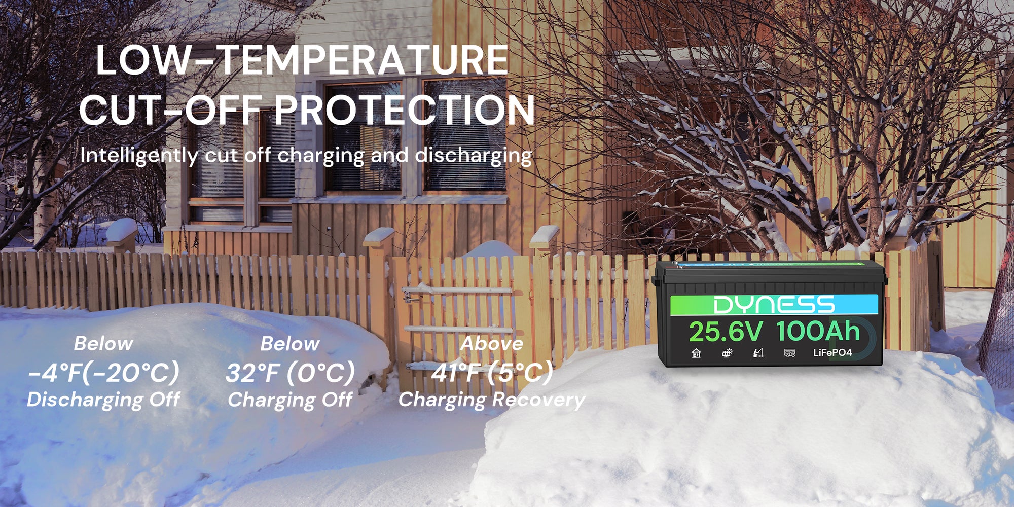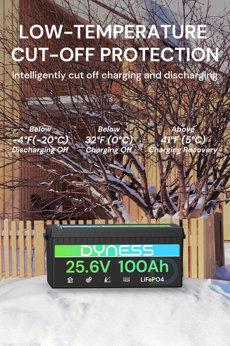 Featuring an automotive-grade low-temperature cut-off design, the battery automatically stops charging when the internal temperature falls below 32°F (0°C) and resumes charging at 41°F (5°C). It also disconnects power at -4°F (-20°C) to protect internal components and ensure safe performance in extreme cold conditions.