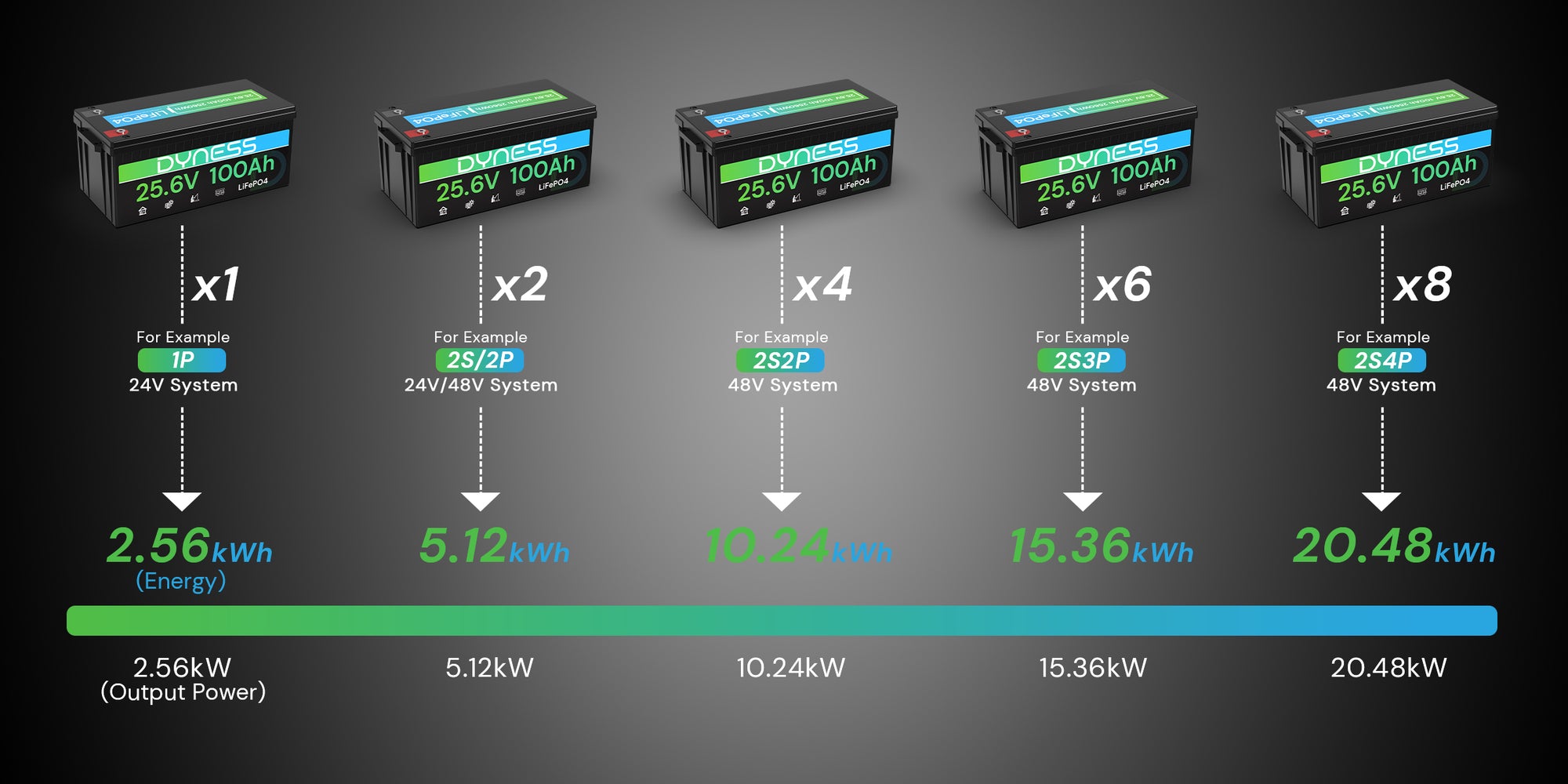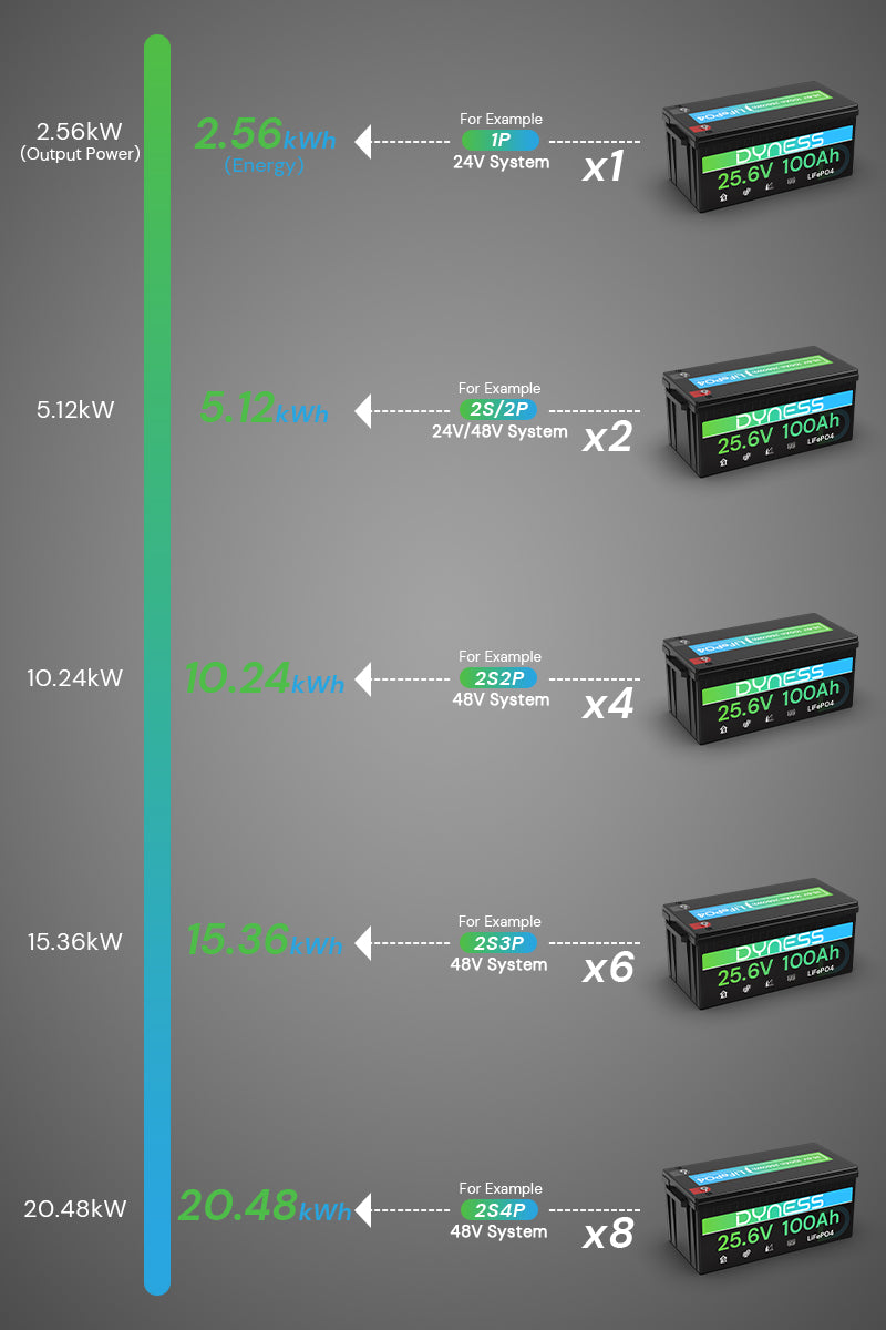 With a powerful 2560Wh capacity, the Dyness 25.6V 100Ah battery supports up to 4P2S configuration, forming a 51.2V 400Ah (20.48kWh) system for extended runtime. Ideal for RVs, off-grid solar setups, marine use, and home backup power storage.