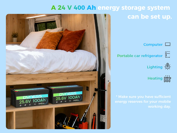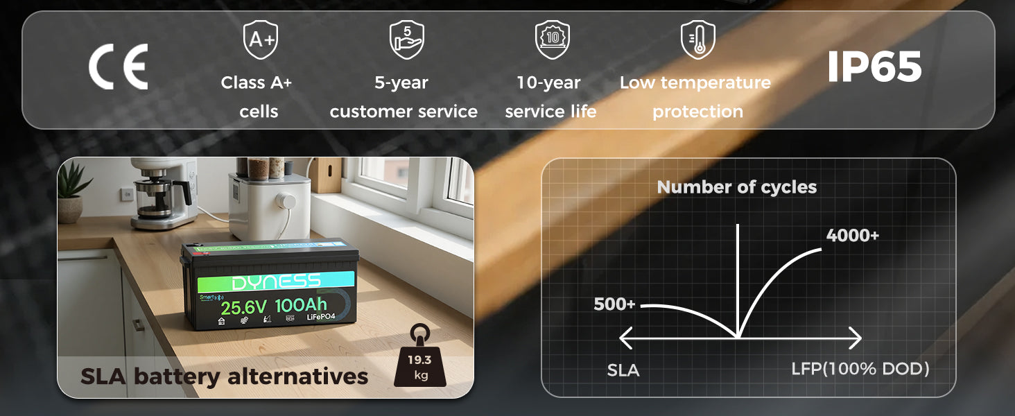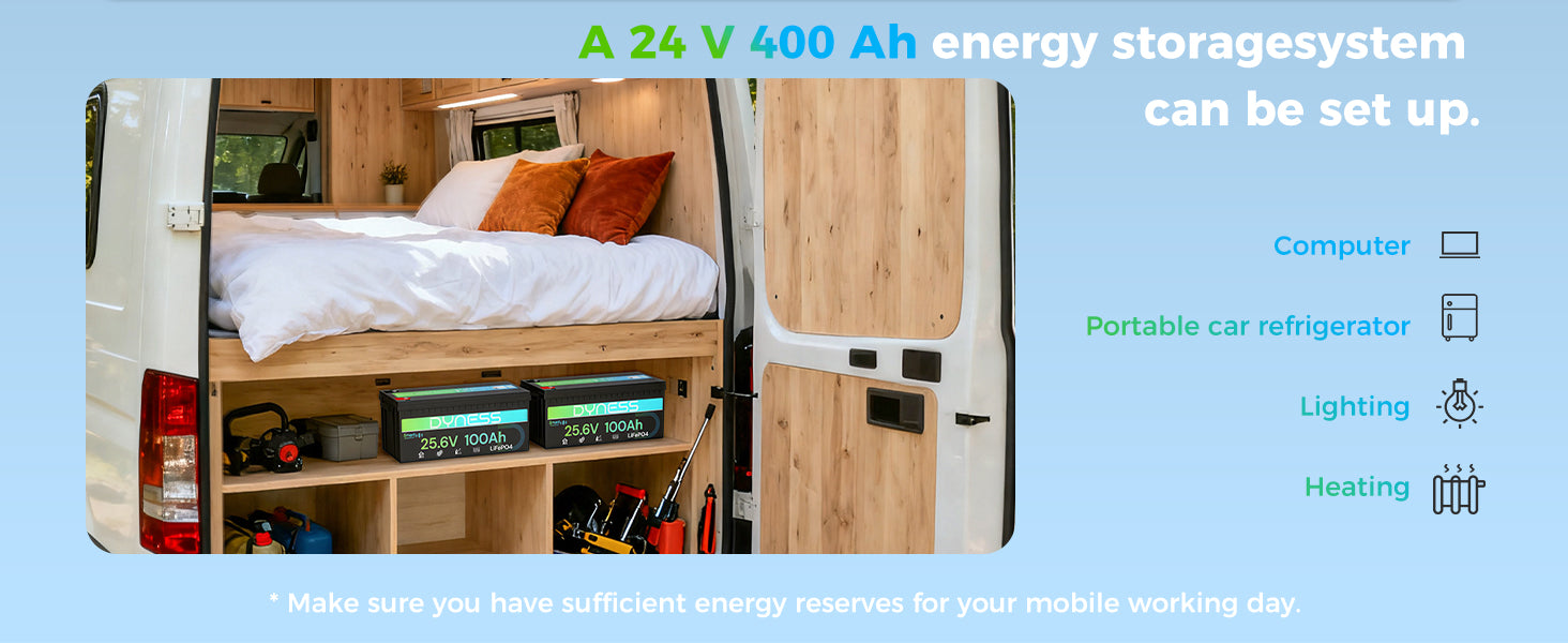 Provides 100A continuous discharge (max 2560W), perfect for RV appliances, off-grid cabins, and home backup solutions.