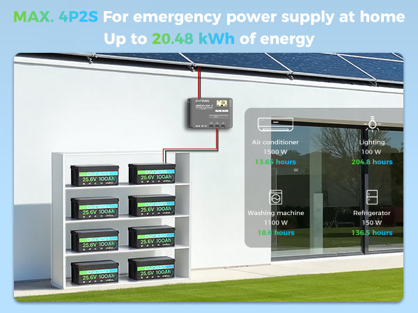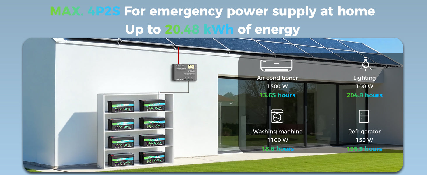 Supports up to 4 in parallel and 2 in series (4P2S) to create a 51.2V 400Ah system—ideal for RVs, off-grid solar homes, or larger backup power needs.