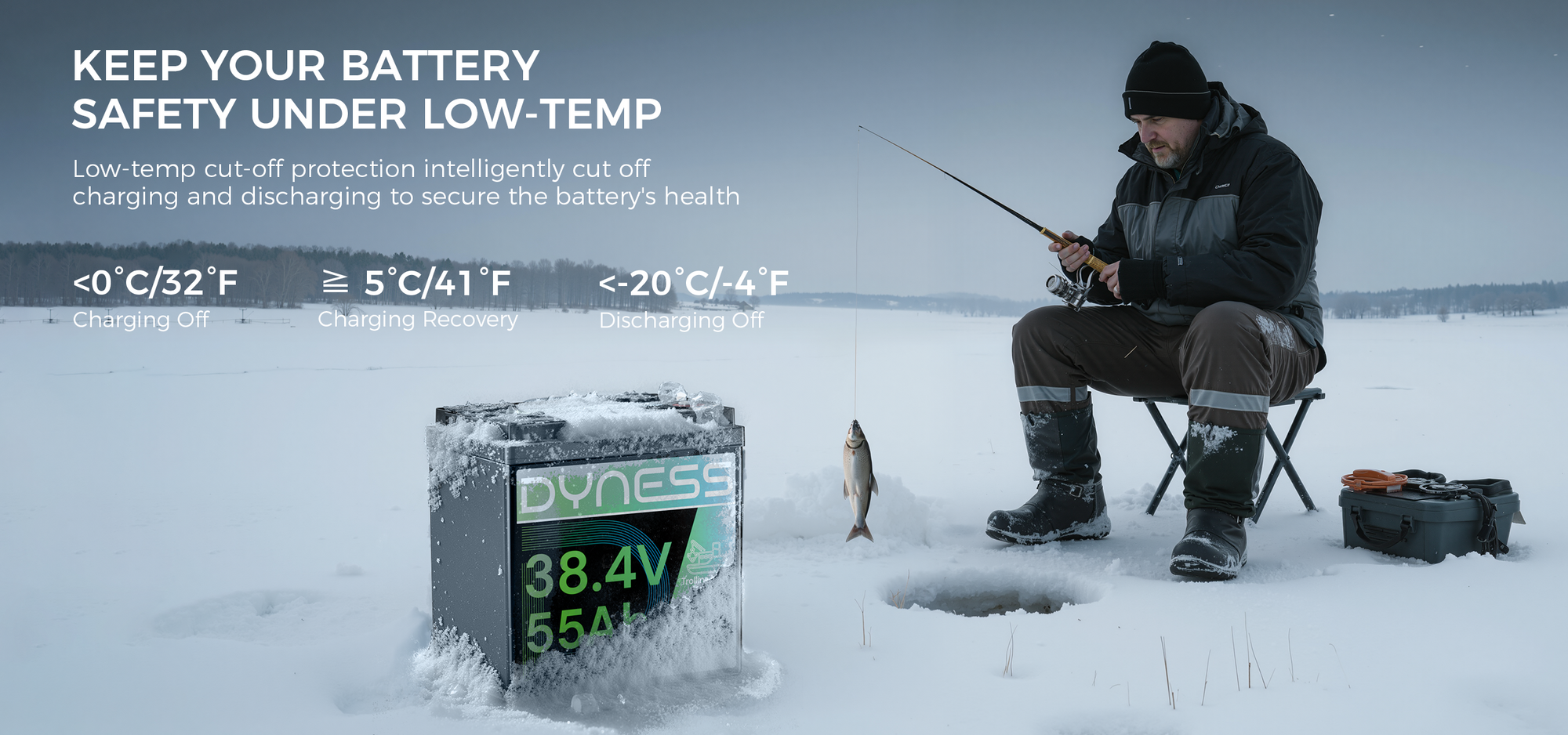 Operates reliably in extreme conditions with a built-in low-temperature shutoff: charging stops below 32°F (0°C) and resumes above 41°F (5°C); safely discharges down to -4°F (-20°C).